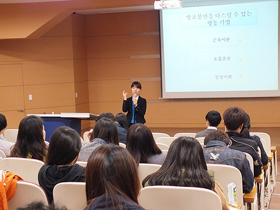 강의를 맡은 이정아 드림심리학습센터장은 “발표하기 전 자신의 부정적인 생각에 대해 의문을 가지고 이를 수정하기 위해 노력해야 하며, 호흡과 이완을 반복 하면 도움이 될 것이다.”라고 전했다.