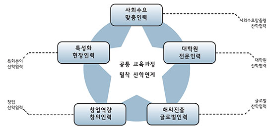 ‘특성화 현장인력’ 양성을 위해 우리학교는 지역 특화 분야를 선도할 특성화 교육과정을 운영하고, 학과 및 전공 간의 융합으로 연계전공 공동 운영을 진행할 계획이다. 기계자동차공학부 미래자동차공학 연계전공을 미래자동차 분야로 변경하고, 컴퓨터공학부 융합소프트웨어공학 연계전공을 융복합소프트웨어 분야로 변경하는 등의 세부계획을 갖고 있다. 또한 향후 학사제도 개선(융합(공유) 전공제 도입)에 따라 연계전공을 주 전공으로 인정하는 방안도 검토 중이다. ‘사회수요 맞춤인력’ 양성을 위해서는 다양한 유형의 교육과정을 운영하고, 지자체와 협업하여 스타기업 가족회사를 지속적으로 확보하고 과정 수를 확대하는 등의 계획을 진행할 예정이다. 특히 ‘대학원 전문인력’ 양성을 위해 대학원 학과 교과과정에 전공창업 및 산학연구 프로젝트 교과목을 편성 및 개설하는 등 학부생뿐만 아니라 대학원생도 참여할 수 있는 기회가 주어질 것이다. ‘창업역량 창의인력’ 양성을 위해서는 입주형 집중 창업보육공간을 운영하고, 실전창업과정 등의 다양한 창업 교육을 수행하고, 대학창업펀드를 조성하여 창업기회를 확대할 계획이다. 한편, ‘해외진출 글로벌인력’ 양성을 위해 해외 거점기관(대학/연구소/기업지원기관)과 MOU를 체결해 해외 분소를 운영하고, 해외 거점기관 및 가족회사의 현장실습과 창업캠프를 통해 취업까지 연계하는 등 글로벌 산학협력을 확대·개편하여 글로벌화를 지속할 예정이다. 현재 미국 샌디에이고 Qualcomm Institute 거점기관과 장단기 현장실습 및 창업캠프를 운영하고 있으며, 프랑스 리옹 상공회의소&에클리에대학 거점기관과도 창업캠프, 단기 현장실습을 운영하기 위해 준비 중이다.