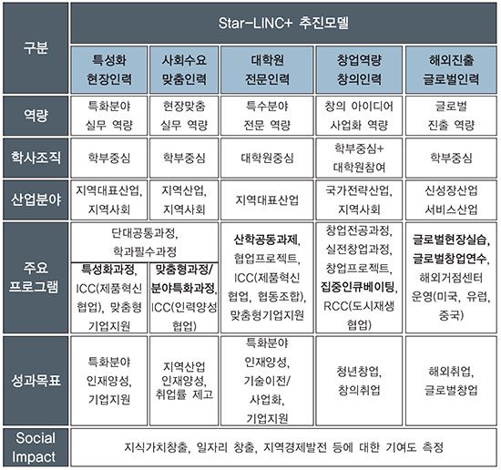 이러한 성과를 토대로 우리학교는 ‘지역사회에 기여하는 산학협력 특성화대학’으로 자리매김하겠다는 목표를 설정했다. 방대욱(컴퓨터공학·교수) LINC+사업단장은 “지난 5년간 LINC사업을 통해 실제로 학생들의 취·창업 활성화를 비롯한 지역기업과의 산학협력에 있어서 많은 성과를 가져왔다.”며 “이렇게 마련된 노하우와 인프라를 활용해 향후 5년간 지속될 LINC+사업은 산학협력을 기반으로 지역사회에 공헌할 수 있는 프로그램을 개발, 운영해 나가겠다.”고 밝혔다. 이를 위해 우리학교는 특히 인력양성을 주요 쟁점으로 보고 ‘스타 네트워크형 인력양성 추진모델(이하 Star-LINC+모델)’을 제시했다. Star-LINC+모델은 참여학과 대상 공통 교육과정과 지역산업 및 지역사회에 밀착된 산학연계를 기반으로 현장 중심 인재를 융복합 네트워크로 양성하는 산학협력 추진모델이다. Star-LINC+모델은 ‘특성화 현장인력’, ‘사회수요 맞춤인력’, ‘대학원 전문인력’, ‘창업역량 창의인력’, ‘해외진출 글로벌인력’ 등 총 5개 모형으로 구분되어 관련 세부계획 및 프로그램이 추진될 계획이다.