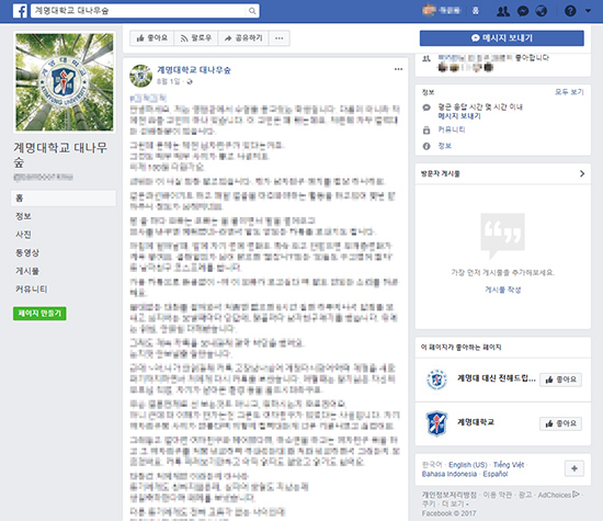 익명 커뮤니티는 대나무숲이 전부가 아니다. 현재 우리학교 학생들이 자주 이용하는 익명 커뮤니티는 페이스북 페이지인 ‘계명대학교 대나무숲’, ‘계명대 대신 전해드립니다’, ‘계명대에 좋아하는 사람이 있다면’ 등 세 곳이고, 게시판 형식의 사이트는 ‘에브리타임’, ‘KMUMU’, ‘계명대 갤러리’ 세 곳이다. 이 중 페이스북 익명 커뮤니티 세 곳의 팔로워 수만 해도 모두 4만4천 명에 달한다. 이들 커뮤니티에서는 간단한 가십거리부터 생활정보, 부동산 거래, 동아리 홍보, 분실물 및 습득물 신고, 학과 내에서 발생한 사건 사고, 학생회에 대한 성토, 학교 측의 고압적인 행정 처리 등 폭넓은 주제가 활발하게 게시된다. 시간표 어플인 ‘에브리타임’의 게시판 목록(9월 6일 기준)을 살펴보면 ‘자유게시판’, ‘홍보게시판’은 물론 ‘비밀게시판’, ‘취업·진로’, ‘장터·원룸’, ‘이상형 적기’ 등 몹시 다양한 주제의 게시판이 있는 것을 알 수 있다. 이들 커뮤니티의 활성화 정도는 우리학교 공식 커뮤니티인 ‘비사광장’을 훨씬 웃돈다.