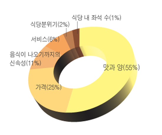 교내에는 모두 6곳의 식당이 있다. 계명인의 식당 선택의 기준을 알고자 ‘교내식당 이용시 가장 고려하는 점은 무엇입니까?’에 대한 설문조사를 실시, 총 1백 20명의 생각을 알 수 있었다. ‘맛과 양’이 55%로 가장 많았으며 ‘가격’이 25%, ‘음식이 나오기까지의 신속성’이 11%, ‘서비스’가 6%, ‘식당분위기’가 2%를 각각 차지했으며 ‘식당 내 좌석 수’는 1%로 영향이 미미한 것으로 나타났다.·설문에 참여해 주신 분 3분께 문화상품권(5천원권) 2매를 드립니다.