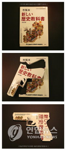 새 역사교과서 책 표지 맨 위에는 '이것은 일본의 최신식 전쟁무기입니다'라고 적혀 있고, 권총으로 바뀐 뒤 책 표지 하단에는 '왜곡된 역사교육은 또 다른 침략을 예고합니다'라는 문구가 영문으로 각각 표기돼 있다.