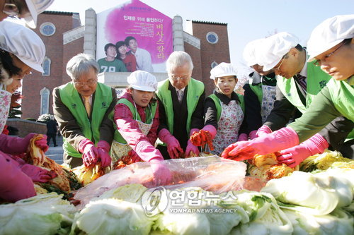 (대구=연합뉴스) 이덕기 기자 = 계명대학교 교직원 등으로 구성된 봉사단체 `사단법인 계명 1% 사랑나누기'가 불우이웃들을 위해 배추 6천 포기로 김장을 담그는 행사를 가져 눈길을 모았다.