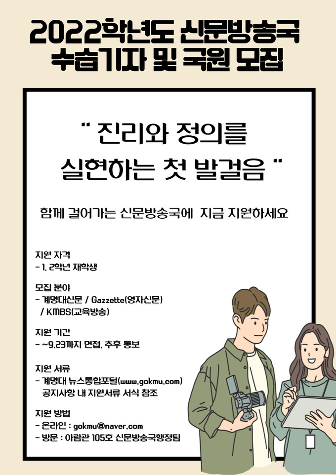 · 모집부서: 계명대신문(국자신문), The Keimyung Gazette(영자신문), KMBS(교육방송)