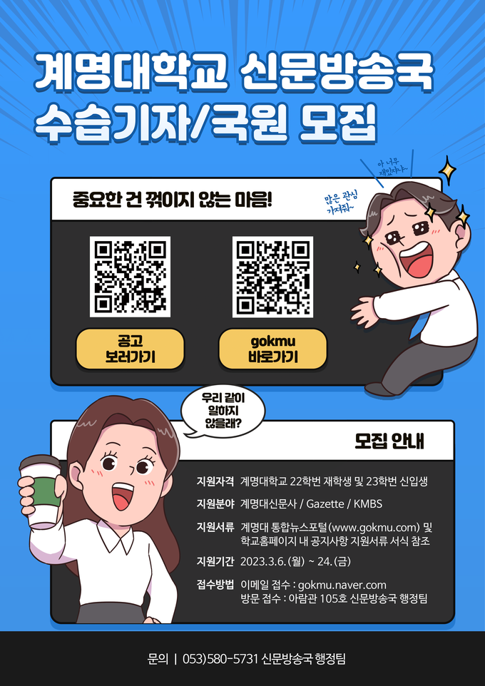 | 211 | 계명대학교 신문방송국 2학기 수습기자 / 수습국원 모집 | 정재호 | 2023/09/18 | 1020 |
