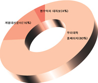 가장 많은 의견은 ‘우리대학 홈페이지’로 전체 의견 중 80%를 차지했고 그 다음으로 16%의 계명인이 ‘계명대신문’이라고 답했다. 마지막으로 각 단대 게시판이나 교내에 걸린 ‘현수막과 대자보’를 통해 학내 소식을 얻는다는 의견은 4%로 나타났다.