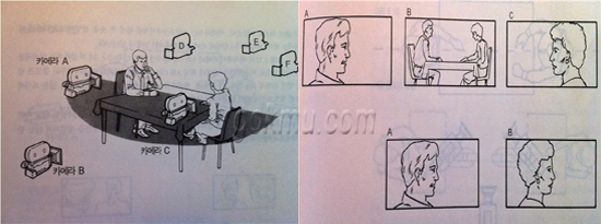 인물이 두 명 이상 등장하는 장면을 촬영할 경우 주의할 점이 있다. 가상의 선은 가급적 넘지 말아야 한다. 가상의 선이란 흔히 이미지 라인(Image Line) 또는 180° 룰(Rule)이라고도 한다. 가상의 선을 유지한 채 촬영하면 그림의 카메라 위치 A, B, C로 찍은 샷이 스토리보드에 보이는 것처럼 대화 장면 연결에 무리가 없다. 그러나 A카메라와 F카메라가 찍은 장면을 연결할 경우 매우 어색해질 수 있다.