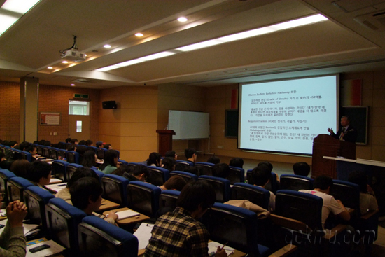 이날 연사로 초청된 (주)현대산업개발 지청 대표이사는 ‘우리나라 기업인의 가치관과 윤리의식’이란 주제로 기업에서 종업원들과 발생할 수 있는 가치관의 차이와 가치관의 기능들을 설명했다.