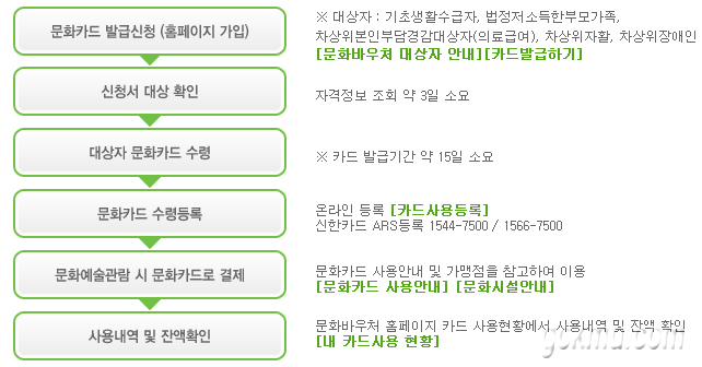 차상위본인부담금경감대상자는 국민건강보험공단에서 발급받은 확인서류를 지참하고 읍·면·동 주민센터에서 문화카드 발급 신청을 할 수 있으며, 또한 인터넷을 사용하기 어려운 저소득층도 읍·면·동 주민센터에서 문화카드 발급을 신청할 수 있게 됨으로 저소득층의 문화바우처 사업에 대한 접근성이 더욱 확대되었다.