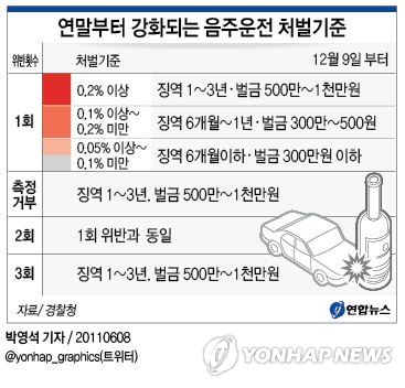 하지만 개정 법률에서는 0.05∼0.1% 미만은 6개월 이하 징역 또는 300만원 이하 벌금, 0.1∼0.2% 미만은 징역 6개월∼1년 또는 벌금 300만∼500만원, 0.2% 이상이거나 측정거부, 3회 이상 위반 때에는 징역 1∼3년 또는 벌금 500만∼1천만원 등으로 처벌이 강화된다.