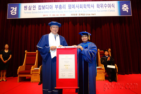 지난 7월 26일 의양관 운제실에서 멘 삼 안(MEN SAM AN) 캄보디아 부총리가 명예사회학 박사학위(이하 명예박사학위)를 수여받았다.