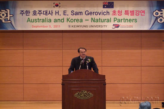 ‘호주와 한국-자연스러운 동반자(Australia and korea-Natural Partners)’ 라는 주제로 열린 이번 강연은 주한 호주 대사 H.E. Sam Gerovich씨가 연사로 초청돼 강연을 진행했다.