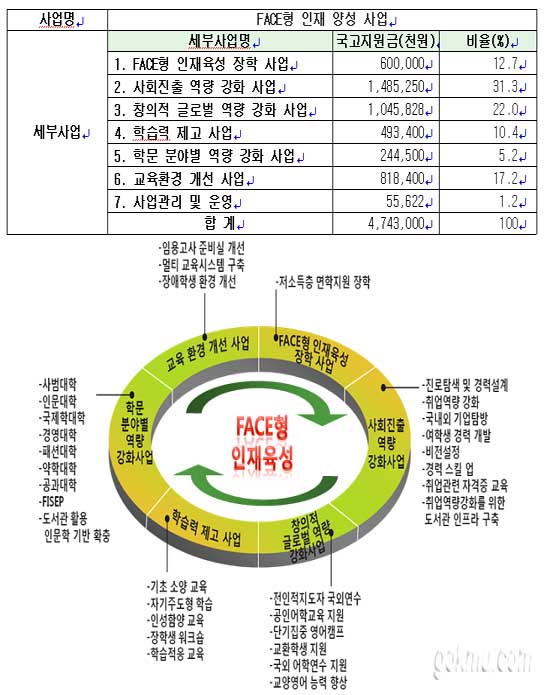 1. 사업 목적: 본 사업은 장학, 취업, 교육, 교수, 학습 및 교육환경 등의 분야에 걸쳐 교육 역량 강화를 통해 우리 대학교의 교육이념, 교육지표 및 교육목표가 지향하는 인재상인 ‘Creative Global Citizen', 즉 도전적 개척정신, 윤리적 봉사정신, 국제적 문화감각, 창의적 전문성을 가진 'FACE형 인재’를 육성하고자 함