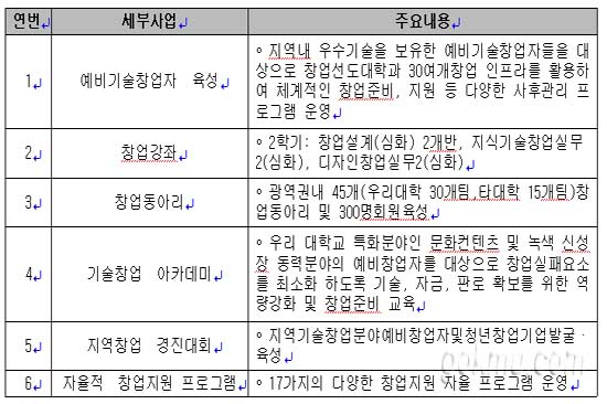 대학이 가진 기술과 인력, 기자재와 장비 등 우수한 인프라를 무상으로 지원해주는 예비기술자 육성사업이 그 하나이며, 창업 붐 조성을 통해 창업자 발굴에 초점을 두는 창업교육패키지 기반 사업도 큰 줄기를 차지하고 있습니다.