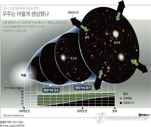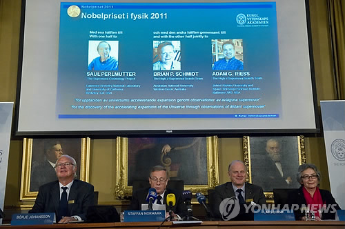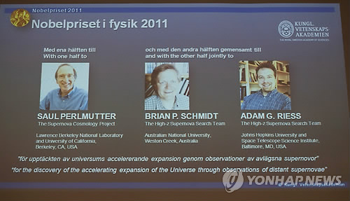 (서울=연합뉴스) 박진형 기자 = 올해 노벨 물리학상은 초신성 관찰을 통해 우주 팽창 속도가 가속되는 사실을 발견한 공로로 사울 펄무터(52·미국)와 브라이언 P. 슈미트(44·미국), 애덤 G. 리스(42·호주/미국) 등 3인에게 돌아갔다.