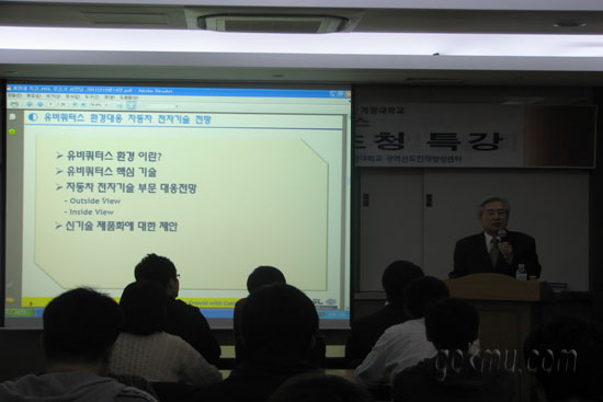 이날 CEO 특강에는 우승기(HSL 일렉트로닉스(주)·대표이사) 씨가 연사로 초청돼 회사소개와 함께 제품소개, 현황 등을 설명했다. 우승기 씨는 “언제 어디서나 이용할 수 있는 최적의 컴퓨팅 기술이 유비쿼터스이며, 다양한 분야와 연결되어 공간을 초월 한다”고 말했다.