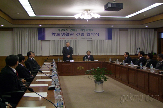 지난 3일 우리학교 본관 소회의실에서 장욱 군위군 군수, 조승제 군의원 등 40여명이 참석한 가운데 ‘군위군 -계명대 향토생활관’ 출연 협약식이 이뤄졌다.