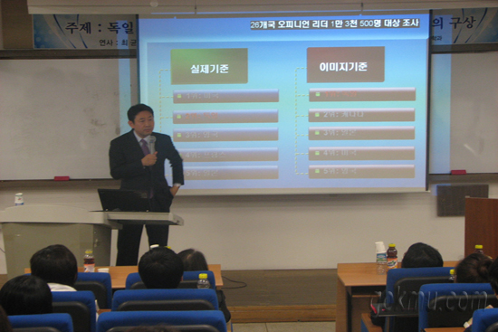 이날 강연을 맡은 최균호(서울여자대학교·독어독문학) 전임강사는 독일어문학과의 미래에 대해 설명하며 “독일은 제조업 중심의 산업구조, 뛰어난 인적자원, 잘 갖추어진 인프라구조 등이 우리나라와 매우 흡사하고, 중국시장진출을 위한 투자도 늘고 있다”고 설명했다.