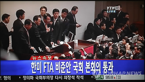 (서울=연합뉴스) 심인성 기자 = 한나라당은 22일 오후 국회 본회의를 열어 한미FTA(자유무역협정) 비준안을 전격 처리했다.