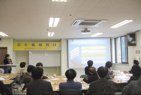 이번 강연은 ‘수업의 효과를 높이는 파워 프레젠테이션’이란 주제로 우리학교 김효정(교양교육대학·초빙전임강사) 교수가 강연했으며, 학생들에게 효과적인 프레젠테이션 기법에 대해 “화면에 글보다 사진과 컬러 비중을 높이고 중요한 부분은 돌출효과를 주면 가독성과 시각적 안정감을 줄 수 있다”고 설명했다.
