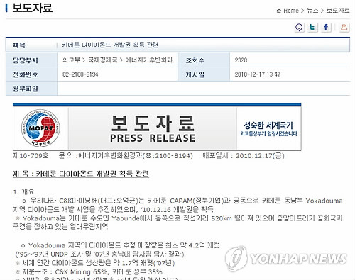 (서울=연합뉴스) 김호준 기자 = 외교통상부가 상장사인 씨앤케이(CNK)인터내셔널의 카메룬 다이아몬드 광산 개발권 획득 공시에 앞서 `CNK 보도자료'를 배포한 것으로 드러났다.