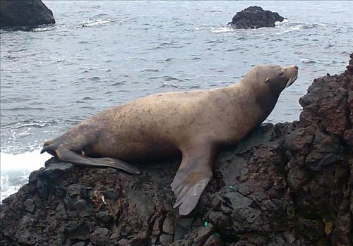 ◇2주 만에 사체로 다시 발견 = 바다사자는 지난달 27일 오후 4시께 제주시 한림읍 비양도 연안에 처음 모습을 드러냈다. 암반 위에 올라앉아 쉬고 있는 것을 순찰하던 전경이 처음 발견했다.