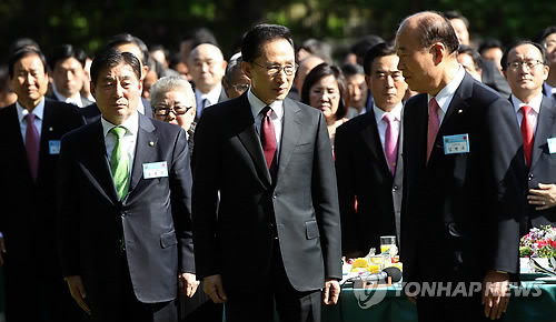이 대통령은 또 "세계적으로 경제가 어렵고 우리도 자유무역협정(FTA)을 한 품목은 성장하고 그렇지 않은 품목은 굉장히 힘들다"면서 "우리가 힘을 합치면 위대한 결과를 만들어 낼 수 있을 것"이라고 협력을 당부했다.
