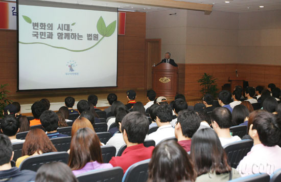 이번 특강은 ‘국민과 함께 하는 법원의 역할’이란 주제로 김창종 대구지방법원장이 초청돼 학생들에게 “법관은 법에 의해 심판하는 임무를 수행하므로 어떠한 요소에도 영향을 받아선 안된다”며 법의 공정성에 대해 강조했다.