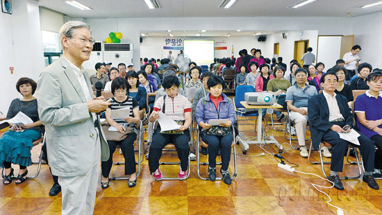 지난 14일 달서구 성당동주민센터에서 열린 인문학 강좌 ‘찾아가는 동네 인문학’에서 백승균(철학·명예교수) 목요철학원장이 ‘인문학으로서 철학과 행복한 삶’을 주제로 강의했다.