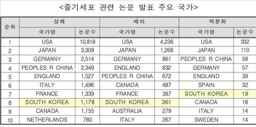 배아 줄기세포 논문(361편) 역시 미국(4천236편), 일본(1천268편), 독일(861편)은 물론 중국(672편), 캐나다(487편) 등에도 뒤진 8위였다.