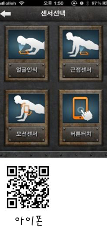 1. 푸시업을 하는 가장 스마트한 방법들푸시업클럽은 아이폰으로 푸시업을 할 수 있는 4가지 방법(얼굴인식, 근접센서, 버튼터치, 모션센서)을 제공하고 있습니다. 첫 번째는 얼굴인식 방법입니다. 두 번째는 근접센서 방식입니다. 배나 가슴이 센서와 가까이 닿아야 카운트가 올라갑니다. 세 번째는 버튼 터치 방식입니다. 마지막으로 모션센서 방식으로 팔뚝에 핸드폰을 고정시키고 푸시업을 하면 위 아래 움직임의 차이를 통해 숫자가 올라갑니다.