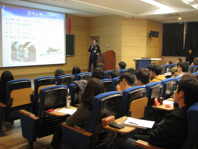이날 강연을 맡은 공군 군수사령관 윤무 씨는 1957년 전남 해남 출신으로, 1977년 그룹사운드(Silver wings) 창단 멤버로 입단한 경력을 가지고 있다. 또한, 그는 과거 우리나라 사람들이 얼마나 예의바르고 점잖은 나라였는지에 대한 예를 들며 우리나라의 건국이념인 ‘홍인인간’을 강조했다.