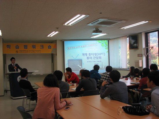 지난 26일, 교육학습개발센터에서 주관하는 ‘계명 튜터링(KPT) 튜터 중간 간담회’가 신바우어관 세미나실에서 열렸다. 이번 간담회에서는 교수학습개발센터 연구원 권세환 씨가 튜터링 활동 진행 현황, 팀 활동 중간보고, 공지사항, 개선사항 나눔 시간의 순으로 진행했다.