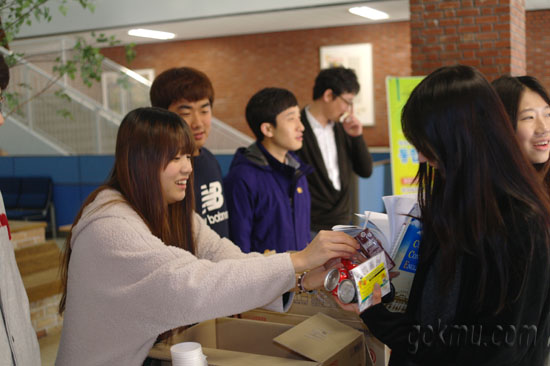 지난 24일 우리학교 사회과학대학 학생회와 패션대학 학생회, 캠퍼스킹 공동주최로 ‘대학생 응원 프로젝트’가 개최됐다. 이날 열린 행사는 중간고사를 맞아 학생들에게 에너지를 주고자 마련했으며, 사회과학대학 로비, 패션대학(동서문화관) 앞에서 에너지드링크와 화장품 등을 전달하고 시험을 잘 치를 수 있도록 응원했다.