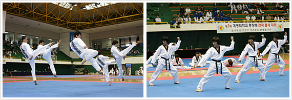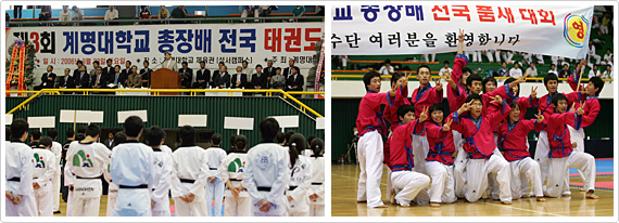 한편 24일(일)에는 같은 장소에서 ‘제1회 계명대학교 총장배 태권도학과 동문도장 경연대회’가 열려, 태권도학과 출신 동문들의 한마당 축제가 펼쳐졌다. 전국에서 태권도장을 운영하고 있는 계명대 태권도학과 동문들을 대상으로 열린 이 행사에는 28개 체육관, 498명의 선수들이 참가해 기량을 겨뤘다. 특히 이번 행사는 동문 선․후배간의 교류라는 점에서 타 대회와는 다른 의미를 가졌다.