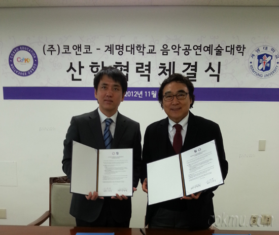지난 20일 음악공연예술대학의 김창재(작곡·교수)학장과 ㈜코앤코의 대표이사 진경훈씨가 업무협약을 체결했다. 양 기관은 취업지원, 현장실습 지원, 교육 프로그램 개발 및 운영 등 교육활동에 상호협력하기로 했다. 더불어 이날 ㈜코앤코 연구소장은 음악공연예술대학의 재학생을 대상으로 ‘코앤코 유아음악의 이해’라는 주제로 특강을 했다.