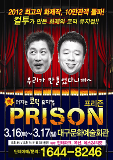 3월 16일부터 17일까지 대구문화예술회관 팔공홀에서 코믹 뮤지컬 프리즌 열린다. 뮤지컬 프리즌은 개그맨 컬투가 제작해서 널리 알려진 뮤지컬이다. 이번 공연은 가수의 꿈을 안고혹독한 준비를 한 주인공들이 사기를 당하고 다시 돈을 마련하기 위해 은행을 털지만 결국 경찰에 잡혀 교도소에서 호시탐탐 탈출의 기회를 찾아 은행에서 턴 돈을 들고 외국으로 도피 하려는 내용을 담고 있는 작품이다.