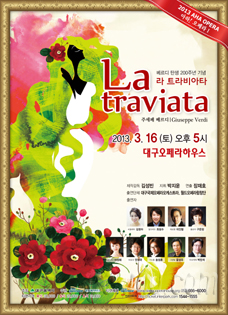 라 트라비아타 공연이 3월 16일 대구오페라하우스에서 공연된다. 이번 공연은 대구국제오페라오케스트라와 월드오페라합장단이 합동으로 출연할 예정이다. 라 트라비아타 공연은 19세기 시골 부유한 출신의 순진한 청년 알프레도가 파티에서 소개 받은 비올레타에게 첫 눈에 반하여 사랑에 빠지게 되고 비올레타는 사랑을 무의한 것으로 여겨 알프레도를 밀어내지만 순정에 감동한 비올레타는 사랑을 받아들이고 교외 동거를 시작한다는 내용으로 전개 된다.