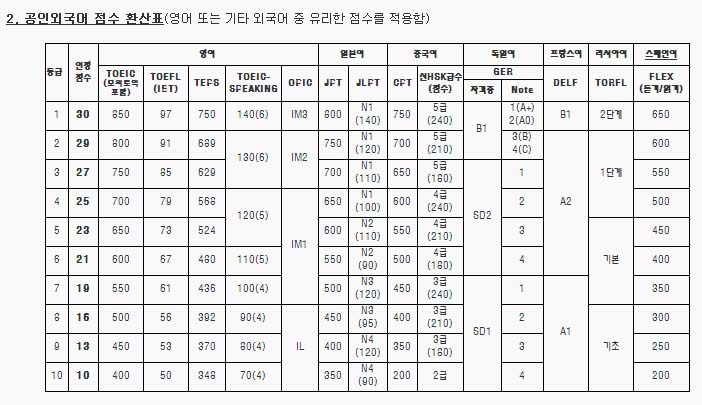 또한 DELF(프랑스어), TORFL(러시아어) 등 등급으로 인정되는 경우는 등급 간 중간점수를 적용하여 반영된다.