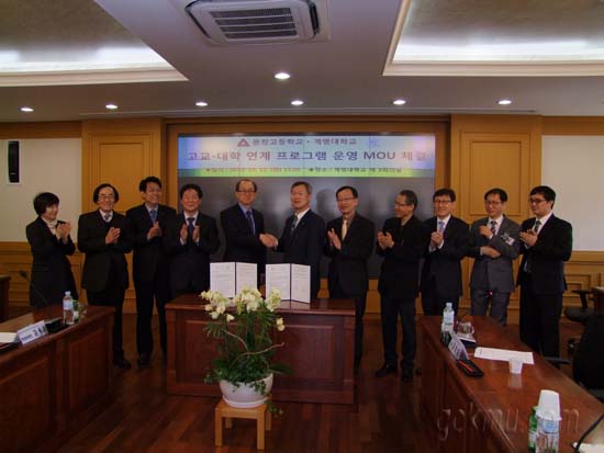 지난 12일, 우리학교와 문창고등학교 MOU 협약체결식이 본관 제3회의실에서 열렸다. 이번 협약은 글로벌시대를 맞이해 글로벌인재와 창의적인 전문 인력을 양성하여 입시문화에 대해 올바른 풍토 조성 및 공교육의 내실화와 입학사정관제의 실효적인 정착을 위해 상호 협력 하고자 맺어지게 되었다.