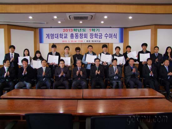 지난 25일 본관 제2회의실에서 ‘2013학년도 1학기 총동창회 장학증서 수여식’이 열렸다. 이번 장학증서 수여식에는 총동창회 김정환(사학·59학번) 회장을 비롯한 관계자들과 우리학교 교수 및 교직원들이 참석한 가운데 진행됐다. 이날 행사에는 재학생 10명에게 각각 1백 만 원씩 총 1천만 원으로 장학금이 수여됐다.