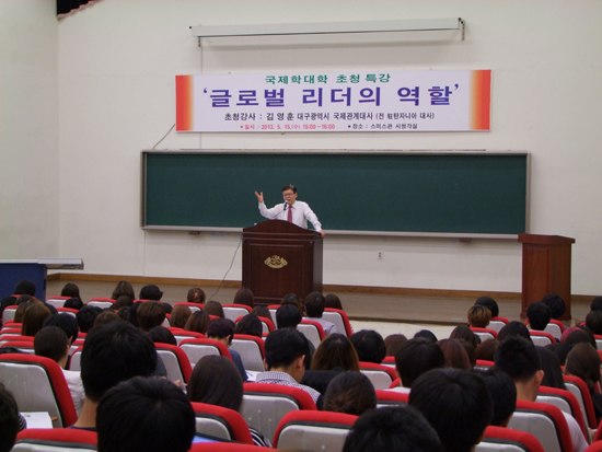 우리학교 국제학대학에서 주최하는 ‘대구광역시 국제관계대사 초청특강’이 지난 15일 스미스관 시청각실에서 열렸다. 이날 특강은 국제학대학 학생 및 교수들이 참석한 가운데 진행했으며 대구광역시 김영훈 국제관계대사가 ‘글로벌 리더의 역할’이라는 주제로 강연했다.