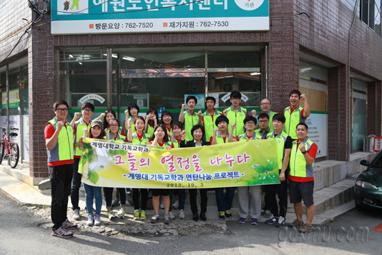 독거노인 분들을 위해 연탄을 나르고 음식과 생필품을 포장해서 직접 드리는 일을 했습니다. ‘계명 1% 사랑나눔 공모전’의 지원을 받아 필요한 물품을 샀습니다. 또한 학과 축제의 수익금과 저의 개인적인 지원금도 보탰습니다.