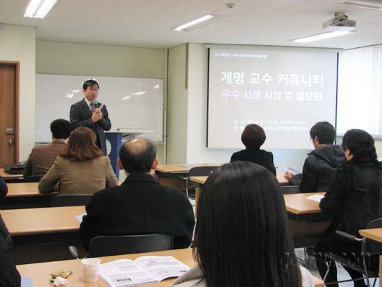 지난 2월 21일 교수학습e러닝개발센터에서 주최한 ‘계명 교수 커뮤니티 우수 사례 시상식 및 발표회’가 교수학습개발센터 세미나실에서 열렸다. 이날 행사는 엄우용(교육학·부교수) e-러닝개발센터장이 맡아 시상식 및 발표회를 진행했다.