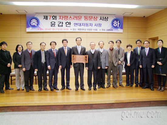 지난 21일 우리학교 경영대학에서 주최한 ‘제7회 자랑스러운 동문상 시상식’이 의양관 118호에서 열렸다. 이날 행사는 이병찬(경영학·석좌교수) 총동창회장, 이중희(회계학·교수) 교무부총장, 박주홍(경영학·교수) 학생복지취업처장, 이지우(경영학·교수) 경영대학장 등이 참석한 가운데 진행됐으며, 윤갑한(경영학·78학번) 현대자동차 사장에게 자랑스러운 동문상을 수여하였다.