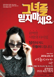 아트플러스씨어터 2관에서 5월 11일까지 연극 ‘그녀를 믿지마세요’가 공연된다. ‘그녀를 믿지마세요’는 김준희가 로맨틱컴퍼니의 도움을 받아 짝사랑하는 차명석에서 고백하려 한다. 하지만 로맨틱컴퍼니의 작전이 김준희로 인해 번번히 실패한 가운데 갑작스럽게 진행되는 그녀의 사랑이야기를 담고 있다. 이 작품은 대학로에서 공연됐던 ‘스틸하트’의 새 버전이다.