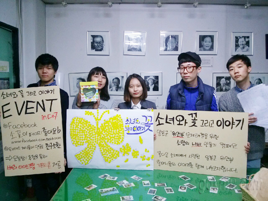 ‘소녀와 꽃, 그리고 이야기’ 프로젝트를 시작하면서 올 한해 여러 지역에서 캠페인을 진행할 계획이었다. 그러던 중 평소에 인연이 있던 ‘정신대 할머니와 함께 하는 시민모임’이 대구 일본군 위안부 역사관 건립을 위해 노력하고 있다는 이야기를 듣고 함께 준비했다. “저희 모임이 만들어지고 처음으로 진행한 캠페인이라서 부족한 점도 많았지만, 기대 이상의 결과에 즐거웠어요. 많은 대구 시민분들이 참여해주셔서 감사했고, 앞으로 다른 지역에서도 캠페인을 잘 할 수 있겠다는 자신감이 생겼어요”