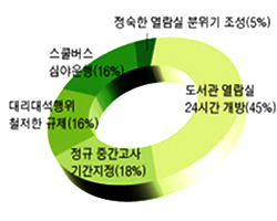 그 뒤를 이어 ‘정규 중간고사 기간 지정’이 18%, ‘스쿨버스 심야 운행’과 ‘대리대석행위 철저한 규제’가 각각 16%, 마지막으로 ‘정숙한 열람실 분위기 조성’이 5%로 집계됐다.