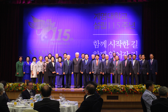축사를 맡은 권영진 대구시장은 “계명대학교가 진리, 정의, 사랑의 정신으로 많은 인재를 배출했음을 알고 있다. 설립 115주년을 진심으로 축하하며 세계에 우뚝 서는 대학으로 거듭날 것을 믿어 의심치 않는다”고 이야기했다. 이어 김관용 경상북도지사는 “오늘의 계명대학교 설립 115주년 선포는 1899년과 1954년의 맥을 잇는 계명대학교의 정체성을 확인하는 계기다. 설립 115년의 역사를 소중히 여기고 오랫동안 이어나가길 바란다”고 축하했다.