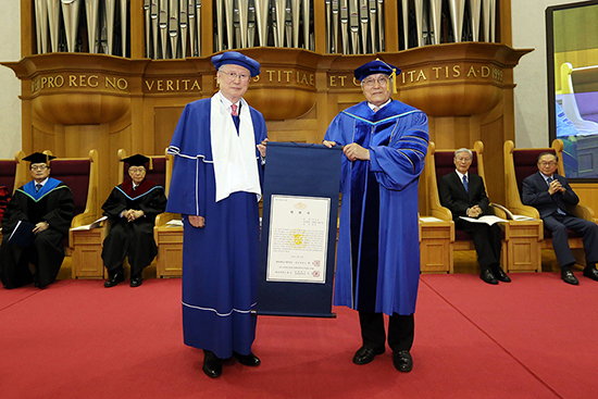 명예박사학위 수여식_지난 9월 26일 아담스채플에서 열린 ‘명예박사학위 수여식’에서 신일희 총장이 김남석 계명문화대학교 총장과 하춘수 전 DGB금융그룹 회장 겸 대구은행장에게 명예박사학위를 수여했다.